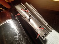 Es gibt 6 Nasen die überwunden werden müssen. Der markierte Bügel hatte sich gelöst und lag lose im Deckel. Der Hebel kann in zwei Richtungen eingelegt werden. Aber nur eine ist richtig. Man merkt das sofort, da der Schlitten sich viel leichter bewegt.