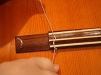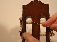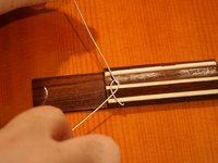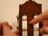 Insert the thick end of the string into the top of the bridge and thread it through until about 3 to 4 inches of the string stick out of the bottom.