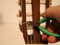 Once you have tuned your guitar, remove the loose ends of the strings from the head and bridge of the guitar with your handheld wire cutter.