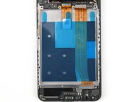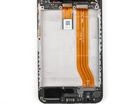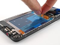 • Lift the back cover off the frame and flip it over the left edge of your phone, laying the cover flat on your work surface.