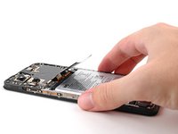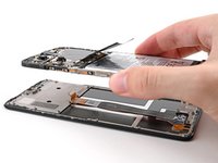 Lift the back cover off the frame and flip it over the left edge of your phone, laying the cover flat on your work surface.
