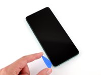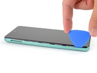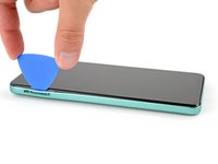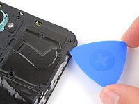 Insert the tip of an opening pick between the back cover and frame, at the SIM card tray cutout.