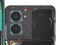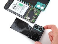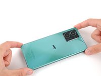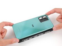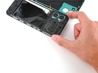 Lift the back cover off the frame and flip it over the left edge of your phone, laying the cover flat on your work surface.