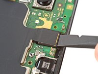 Use the flat end of a spudger to pry up and disconnect the battery press connector from the bottom edge of the motherboard.