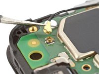 Slide one arm of a pair of tweezers under the metal neck of the black antenna cable's connector head, near the center of the board.