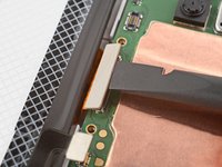 Use the flat end of a spudger to pry up and disconnect the back cover press connector from the bottom edge of the motherboard.