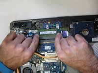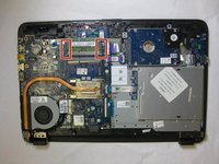 With the back panel removed, orient the laptop with the fan located in the bottom left corner.