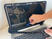 Insert the flat end of the plastic opening tool between the screen and plastic frame.