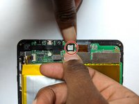 Using your blunt tweezers, lift the front camera gently away from the board.