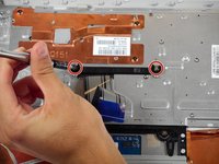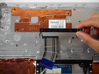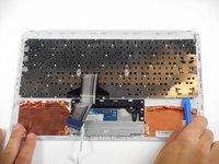 Using tweezers, peel off the two pieces of copper tape that keep the keyboard’s metal cover attached to the keyboard mount.