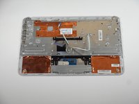 Using tweezers, pull back the three metallic-colored pieces of tape near the top left corner of the keyboard mount.