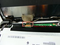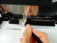 Lift the keyboard ribbon lock bar and use tweezers to disconnect the keyboard ribbon from the motherboard.