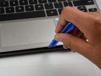 Using a sharp tool, remove the six adhesives from the bottom of your laptop to expose the screwheads underneath. Two of the pads are small and four are larger.