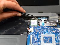 Use your tweezers to pull the two metal pieces connecting the two wires to the top of the green wifi card above the motherboard.