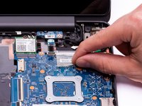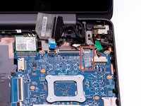 With the Webcam ZIF connector tab in the upright position, gently pinch the black lifting tab and remove the connector from the ZIF connector on the motherboard.
