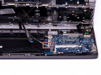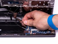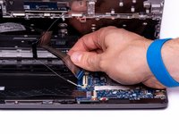 With the hook on the Halberd Spudger, lift the ZIF connector that is holding the Touchpad ribbon cable. The Touchpad ribbon cable is the smaller of the two ribbon cables.
