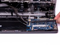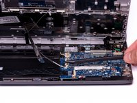 Using the hook on the halberd spudger, lift the external media board ZIF connector attached to the motherboard.