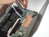 Using a plastic opening or prying tool, insert the tool between the keyboard and bottom casing. Then rotate the tool away from the laptop to open it up.