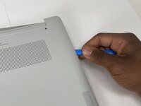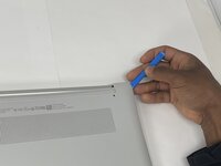 Insert an opening tool into the seam between the lower case and the chassis, near the hinge.
