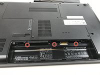 Ensure that the laptop is completely powered off, then flip it over to identify the battery latch located towards the bottom of the back panel.