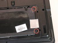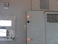 • Remove the two Phillips #0, 2.0×5.0 mm hard drive access cover screws. Do not remove them fully. The screws will stay in place on the cover plate.