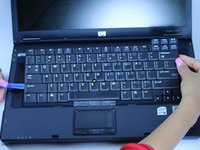 Press down firmly on the four latches shown in the photo to detach the key board. This will unlock the latches holding the keyboard down, doing this will grant you access to the inside of the computer.