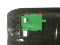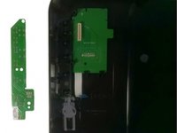 Unscrew the three screws indicated in the image. Unplug the connection from the screen, lift up the board, and remove from the panel. Pull the button out.