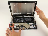 Underneath the tape, disconnect the LCM cable, the larger wire that was underneath the tape, from the back of the tablet screen.