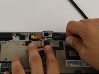 Underneath the tape, disconnect the LCM cable, the larger wire that was underneath the tape, from the back of the tablet screen.