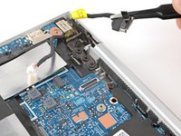 • Use the point of a spudger or your fingernail to push on alternating sides of the power connector's sliding connector to walk it completely out of its socket near the left hinge.