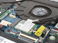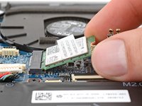 Slide an arm of a pair of angled tweezers under the metal neck of one of the coaxial connectors on the WLAN (Wi-Fi) module, located just below the fan.