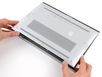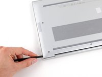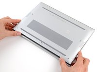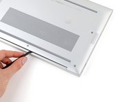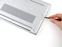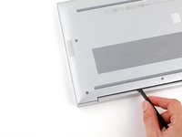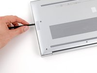 Insert the flat end of a spudger between the rear edge of the bottom cover and the frame, near the middle screw and ELITEBOOK text.
