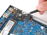 Use the point of a spudger or your fingernail to push on alternating sides of the power connector's sliding connector to walk it completely out of its socket near the left hinge.