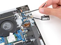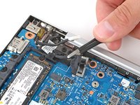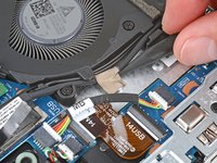 Slide an arm of a pair of angled tweezers under the metal neck of one of the coaxial connectors on the WLAN (Wi-Fi) module, located just below the fan.