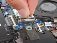 Use your fingers to grip the plastic pull tab on the right display cable press connector, below the fan.