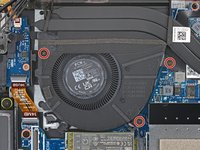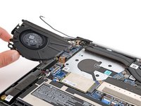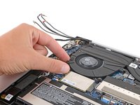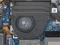 Pull the fan towards the laptop's left edge to slide the top right corner out from under the heat sink.