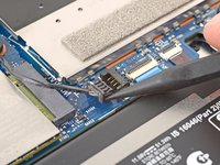 Use your fingers to grip the plastic pull tab on the left display cable press connector, located below the fan.
