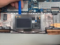 Use an opening tool or spudger to lift the metal bracket with the touchpad off of the laptop.