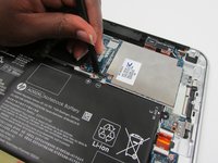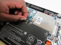 Disconnect the battery to system board connector by pushing gently on it with a plastic pry tool and then pull it away from the system board.