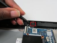 Disconnect the battery to system board connector by pushing gently on it with a plastic pry tool and then pull it away from the system board.