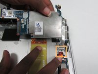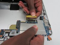 Lift the clear tape which is attached to the power button board cable and the motherboard.