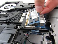 Using both thumbs, locate the two metal clips and pull them apart, allowing the RAM chip to pop upwards.