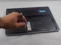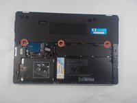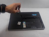 Flip the laptop over and locate the 2 tabs on the left or right sides. They will be slightly visible in the space between the keyboard and frame.