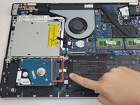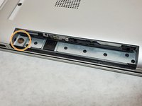 One 2.5mm screw, is located where the disk reader was once located. Use a Phillips #00 screwdriver to remove the single screw that connects the bottom cover of the laptop to the bottom frame.
