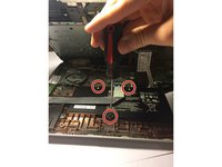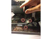 Flip the laptop over on its back and remove the two depressed stickers in the middle to reveal the two central 6.0 mm Phillips-head screws.