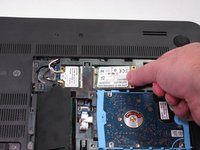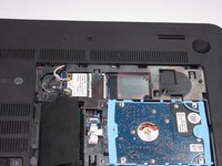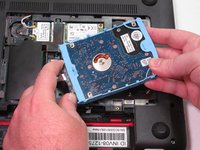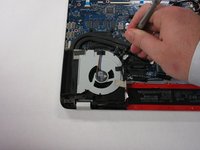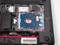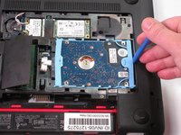 Use the plastic opening tool to pry the hard drive away from the board. Notice that there is a slit centered at the back of where the hard drive is sitting. This is where you'll insert the plastic opening tool as shown in the photo. Finally, pry with the plastic opening tool to remove the hard drive.
