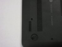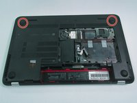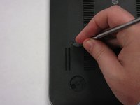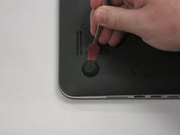 Remove the highlighted rubber stoppers with a metal spudger as pictured. They should expose a screw that you will need to remove in a later step.