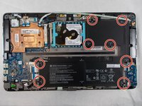 Using a functioning screwdriver i.e Phillips #1 screwdriver, carefully remove the eight screws securing the battery to the device. Unscrew each one slowly and set them aside in a safe spot, like a small container, to prevent loss. Ensure all screws are completely removed and that the battery is fully detached before proceeding to lift it out.