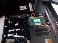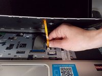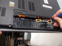 Once the battery is removed, you will need to remove the bottom cover. Pull the cover off of the computer. There will be two screws that need to be removed which hold the keyboard in place. You will need a plastic prying tool to push the keyboard out. Carefully remove the two ribbons connecting the keyboard to the laptop and then you can remove the keyboard.