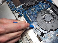 Flip the lock open on the ZIF connector using the opening tool to detach the ribbon from the motherboard.